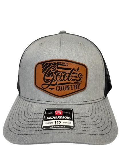 Get Me To God's Country Trucker Hat, Worship Prayer God Laser Engraved Leather Patch Mesh Back Trucker Hat